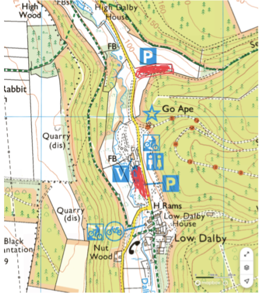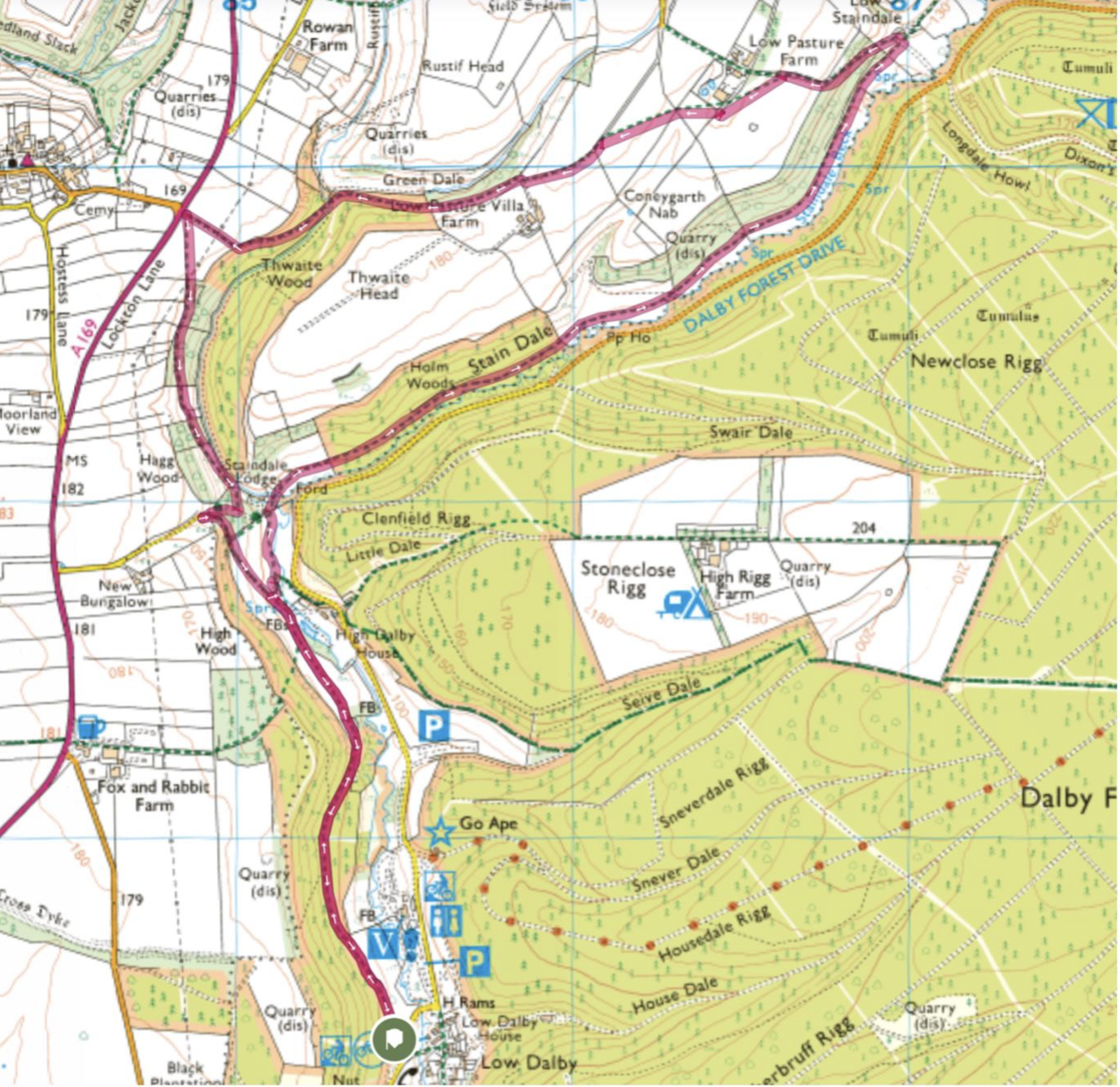 from Thornton le Dale take Whitbygate (signposted to Dalby Forest) after 2.2 km turn right. On reaching the entrance barriers your car registration will be recorded and the barrier will raise. Follow road down into Dalby, follow signs for Visitor Centre and later instructions from carpark marshals.