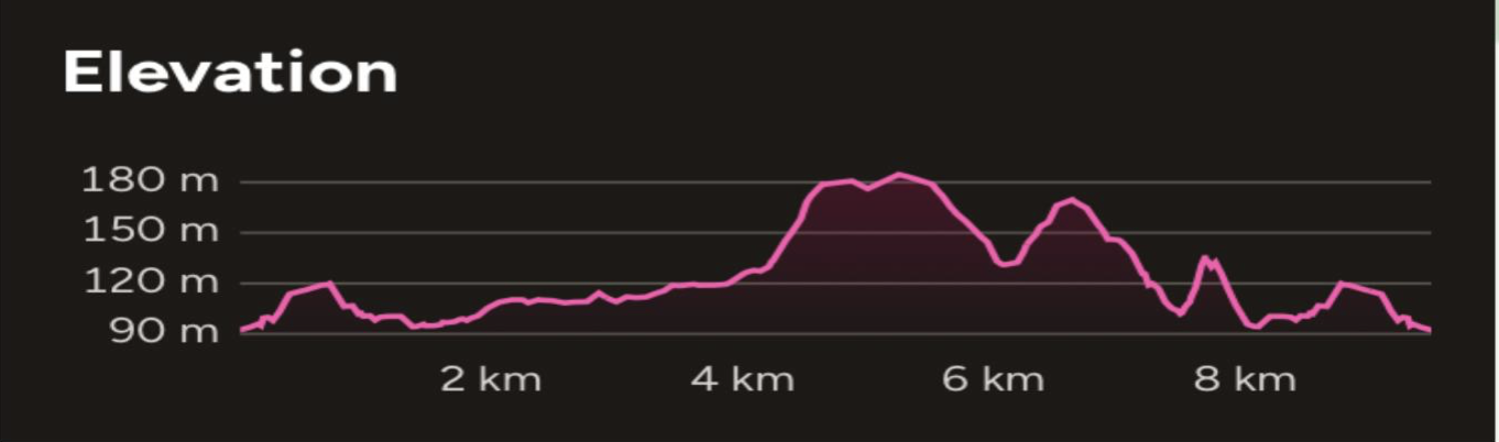 The first half of the course is fairly flat, from halfway you will meet the first of three steepish hills. At the top of the first the route crosses some fields, firstly one with foraging sheep, then after two gates two pasture fields separated by a stile.